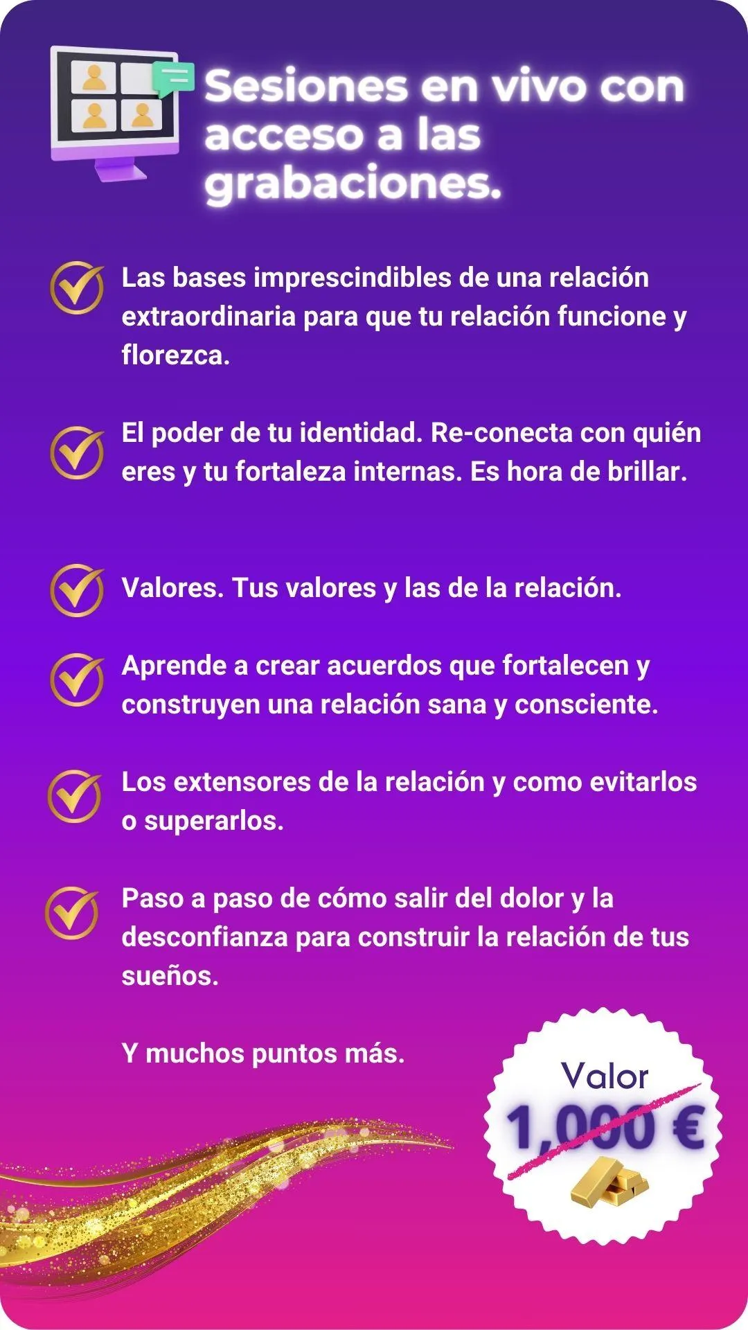 Un programa completo y consciente, diseñado para guiarte y ayudarte, en el que te doy la mano en el camino de las relaciones de pareja, a travez de un paso a paso con conocimientos que muy pocas personas conocen y con alto valor y efectividad en su implementación.