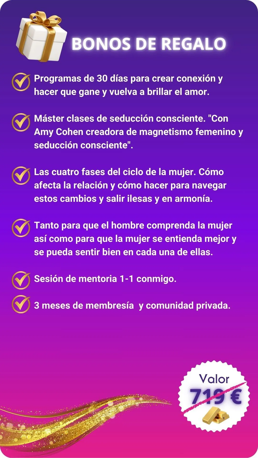 2) Conocimientos que muy pocas personas conocen y quedarán un giro a cómo ves, comprendes y gestionas tu vida amorosa. Que te permitirá hacer las paces con tu pasado renovar y construir tu relación sobre bases sólidas a prueba de fuego.